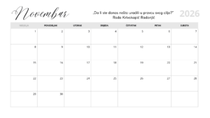 Novembar 2026 Kalendar Rada Krivokapic Radonjic G&M